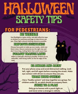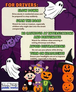This Halloween, please drive slowly in residential areas and be on the watch for trick-or-treaters. Be cautious at intersections and driveways, avoid distractions and ensure your headlights are on to improve visibility in the dark.