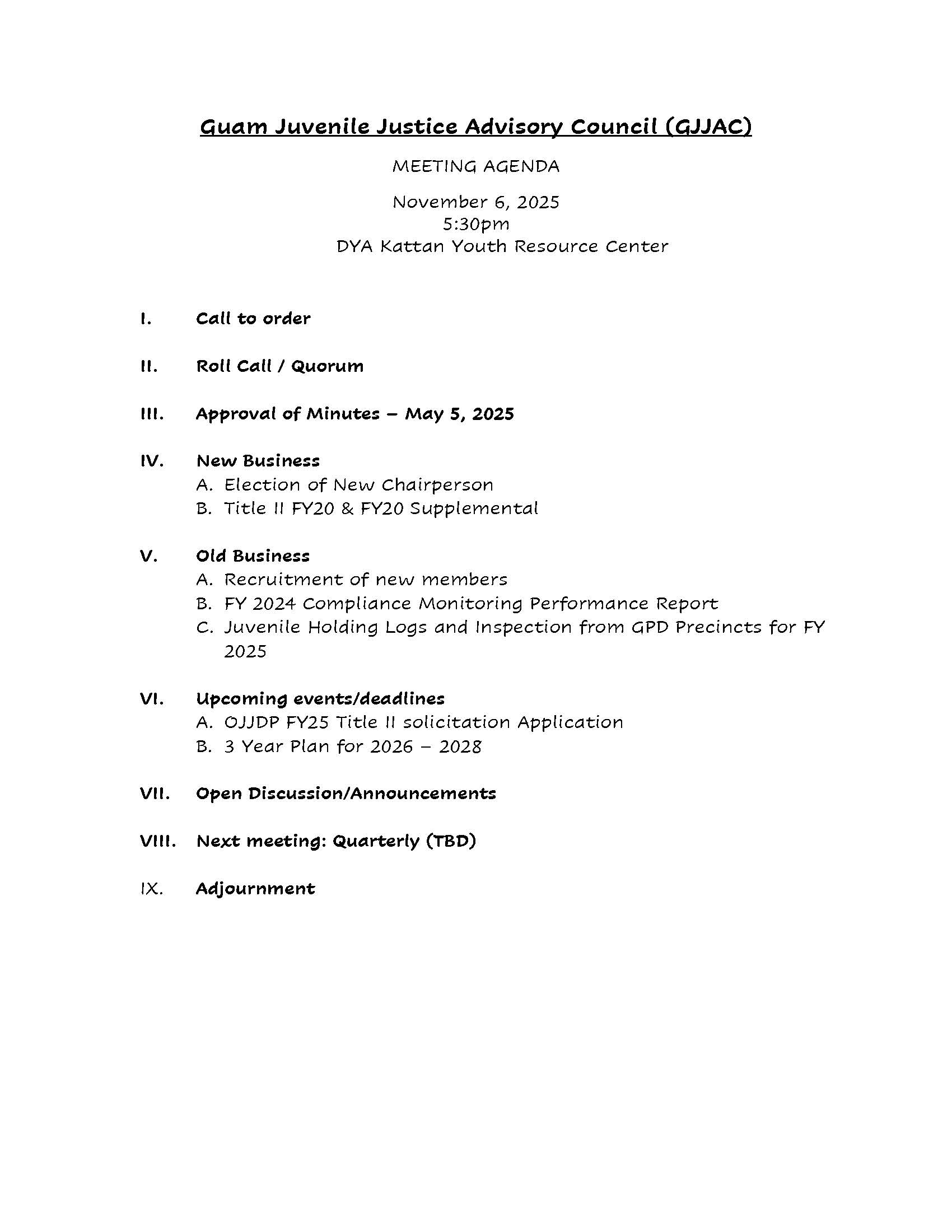 DYA will have their 2025 Guam Juvenile Justice Advisory Council meeting on Thursday, November 6, 2025, at 5:30 p.m. The meeting will take place at DYA's Kattan Youth Resource Center in Mangilao; The address is 228 Teresita St., Mangilao.