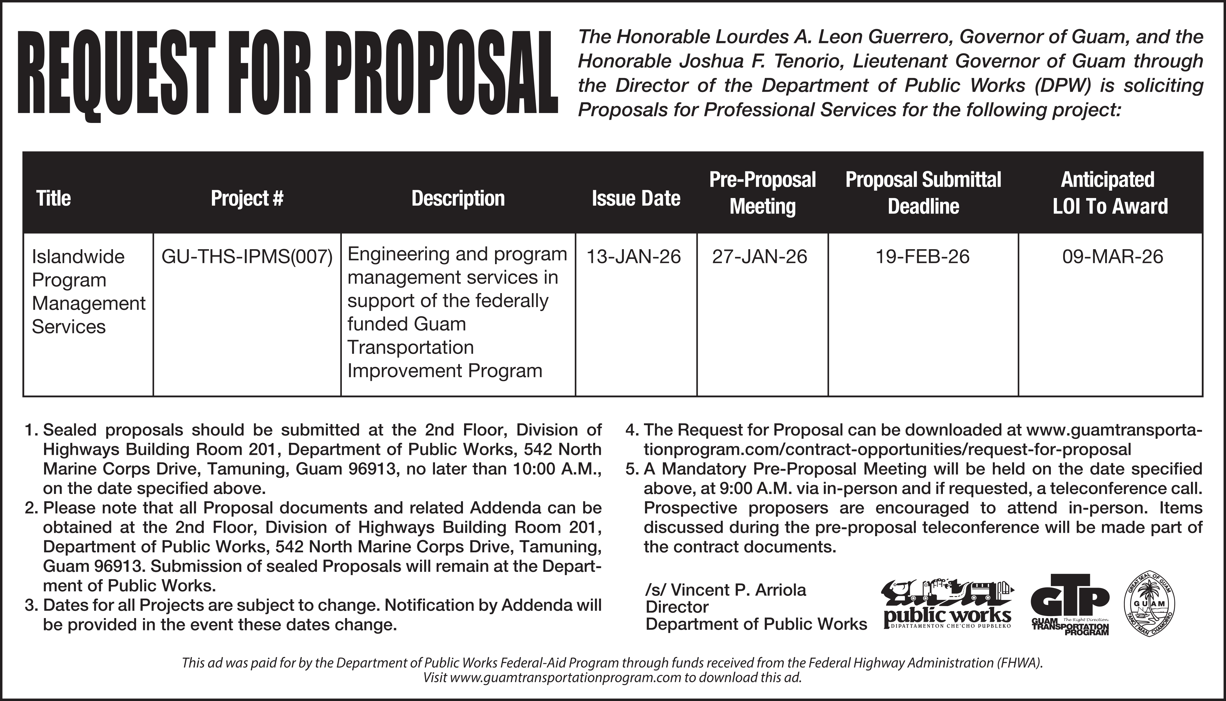 1. Sealed proposals should be submitted at the 2nd Floor, Division of Highways Building Room 201, Department of Public Works, 542 North Marine Corps Drive, Tamuning, Guam 96913, no later than 10:00 A.M., on February 19, 2026.