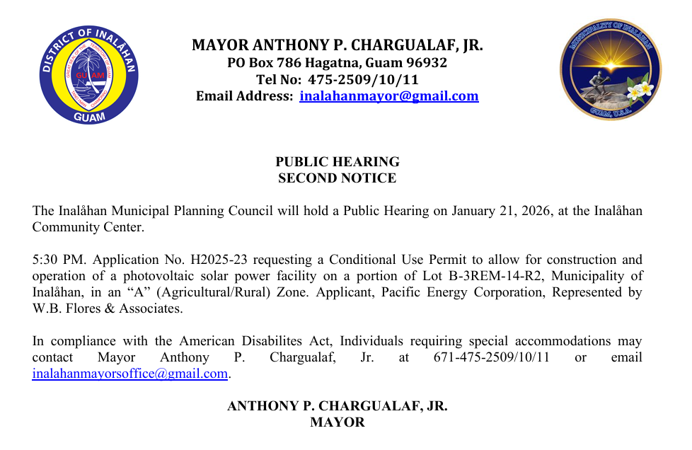 Second Notice, Public Hearing 5:30pm PRESS RELEASE Posted on: 01/19/2026 09:08 AM Posted by: Beatrice Cruz, Jaeline Chargualaf, AA Department(s): MAYORS COUNCIL OF GUAM Division(s): INALÅHAN- INARAJAN Notice Topic(s): PUBLIC HEARING Types of Notice: PRESS RELEASE For Audience(s): PUBLIC Share this notice Second Notice, Public Hearing 5:30pm Share through Whatsapp, Facebook, Email and more…