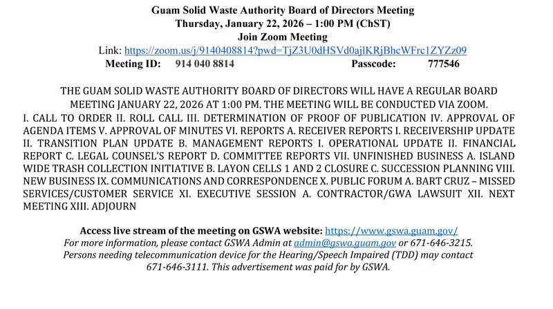 GSWA Board Meeting - January 22, 2026 - 1:00 PM MEETING Posted on: 01/22/2026 09:39 AM Posted by: Guam Solid Waste Authority Meeting Date: 01/22/2026 01:00 AM Department(s): GUAM SOLID WASTE AUTHORITY Division(s): Guam Solid Waste Authority Notice Topic(s): MEETING Types of Notice: MEETING For Audience(s): PUBLIC Share this notice GSWA Board Meeting - January 22, 2026 - 1:00 PM Share through Whatsapp, Facebook, Email and more…
