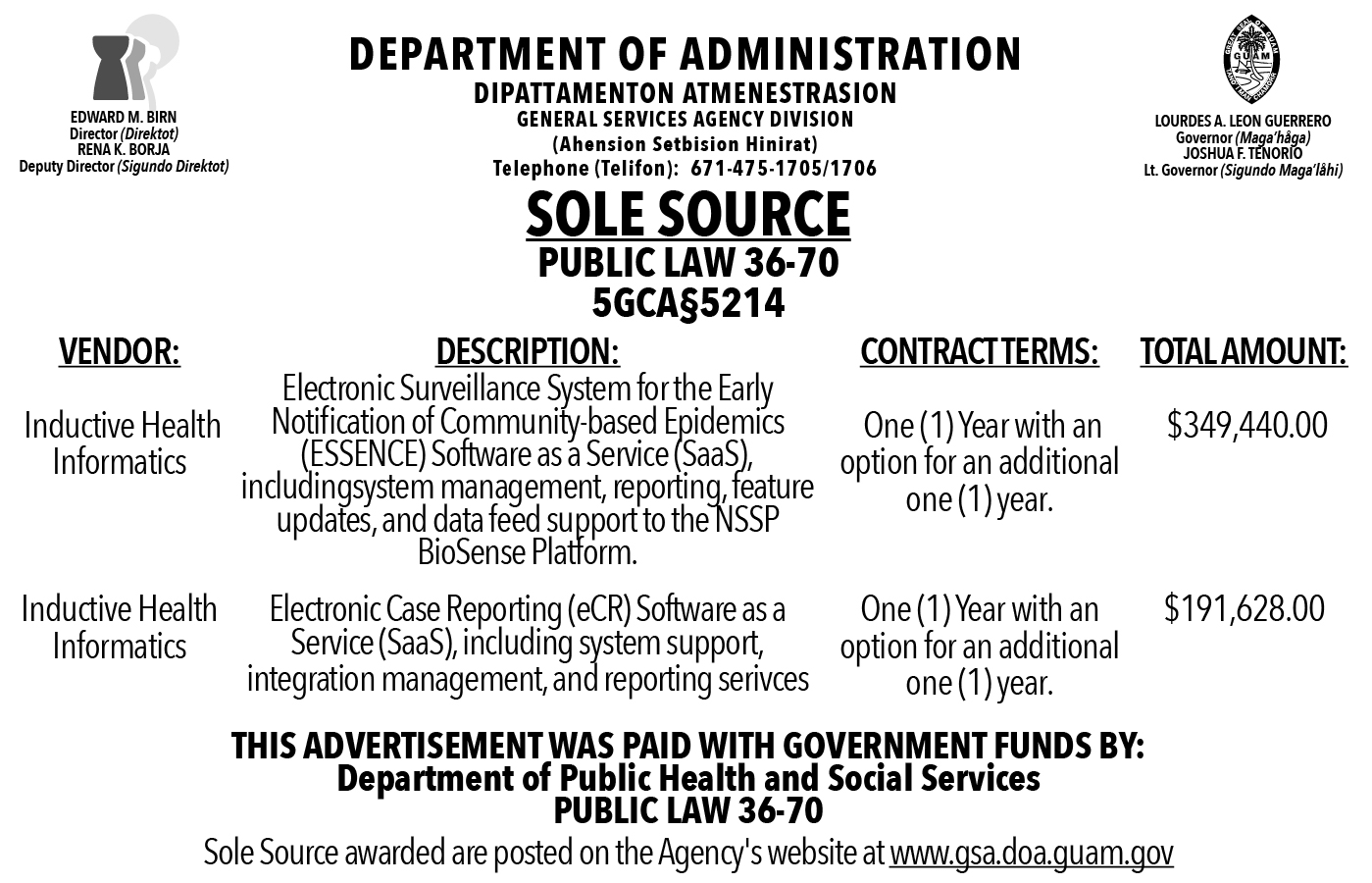 Sole Source - Inductive Health Informatics - Electronic Surveillance System & Electronic Case Reporting Software ANNOUNCEMENT Posted on: 02/26/2026 08:00 AM Posted by: Ryan Eriksen, Buyer II Department(s): GENERAL SERVICES AGENCY Division(s): GENERAL SERVICES AGENCY Notice Topic(s): GENERAL ANNOUNCEMENT Types of Notice: ANNOUNCEMENT For Audience(s): PUBLIC Share this notice Sole Source - Inductive Health Informatics - Electronic Surveillance System & Electronic Case Reporting Software (click here to view) Sole Source - Inductive Health Informatics - Electronic Surveillance System & Electronic Case Reporting Software Share through Whatsapp, Facebook, Email and more…