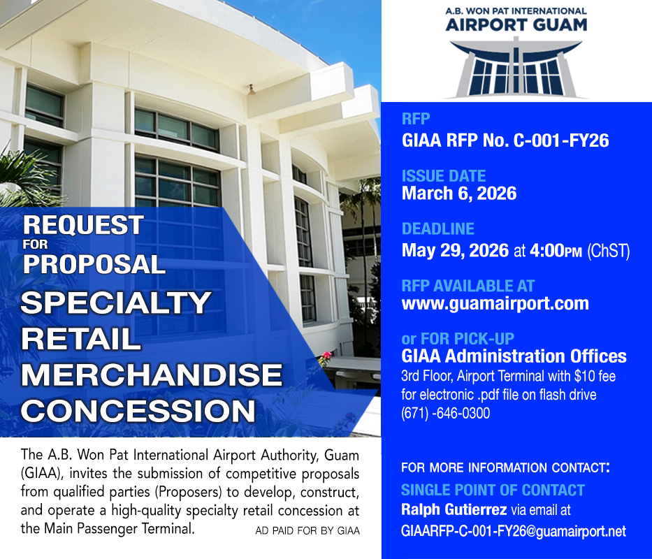 GIAA RFP No. C-001-FY26 ANNOUNCEMENT Posted on: 03/06/2026 08:17 AM Posted by: Wana Wintterle Department(s): A.B. WON PAT INTERNATIONAL AIRPORT AUTHORITY Division(s): PROPERTY MANAGEMENT OFFICE DIVISION Notice Topic(s): RFP Types of Notice: ANNOUNCEMENT For Audience(s): PUBLIC Share this notice GIAA RFP No. C-001-FY26 Share through Whatsapp, Facebook, Email and more…