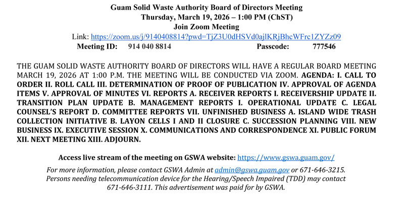 First Notice: GSWA Board Meeting - March 19, 2026 - 1:00 PM MEETING Posted on: 03/12/2026 12:00 AM Posted by: Guam Solid Waste Authority Meeting Date: 03/19/2026 01:00 PM Department(s): GUAM SOLID WASTE AUTHORITY Division(s): Guam Solid Waste Authority Notice Topic(s): MEETING Types of Notice: MEETING For Audience(s): PUBLIC Share this notice First Notice: GSWA Board Meeting - March 19, 2026 - 1:00 PM Share through Whatsapp, Facebook, Email and more…