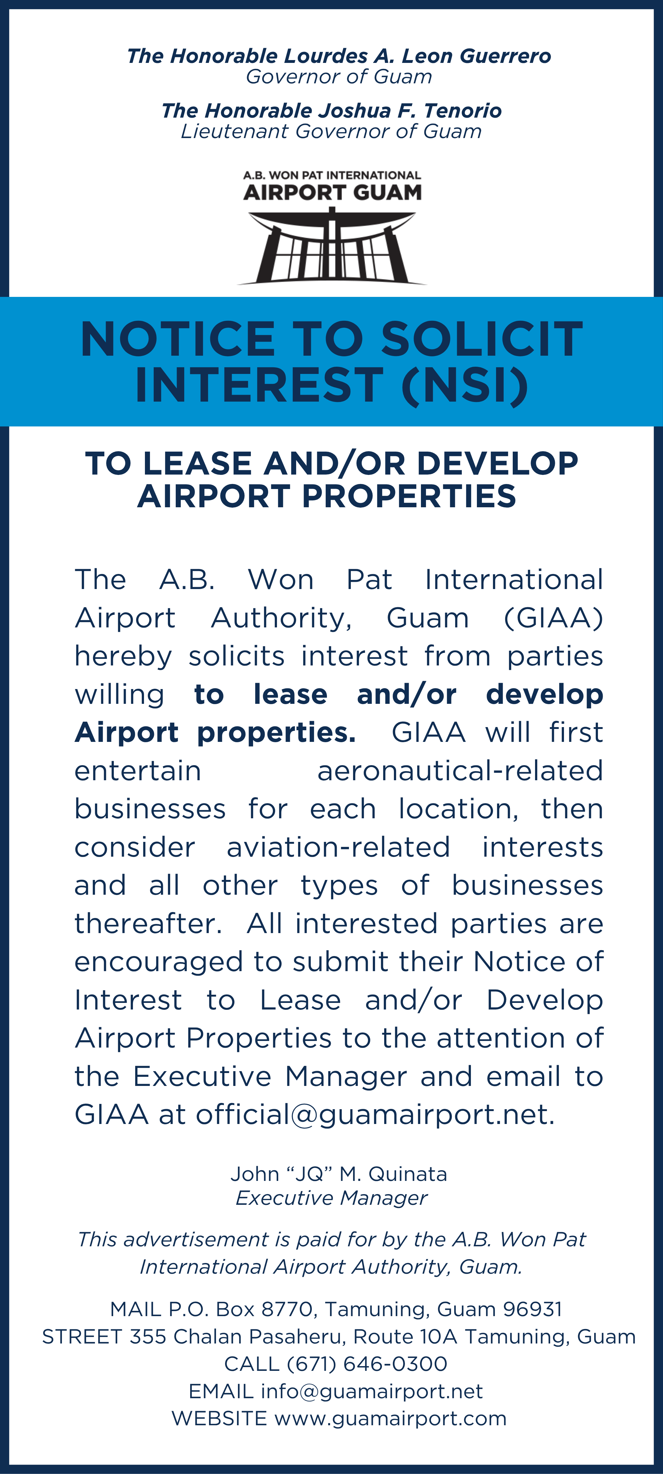 NOTICE TO SOLICIT INTEREST (NSI) TO LEASE AND/OR DEVELOP AIRPORT PROPERTIES ANNOUNCEMENT Posted on: 04/28/2026 10:12 AM Posted by: Wana Wintterle, Administrative Assistant Department(s): A.B. WON PAT INTERNATIONAL AIRPORT AUTHORITY Division(s): PROPERTY MANAGEMENT OFFICE DIVISION Notice Topic(s): PRESS RELEASE Types of Notice: ANNOUNCEMENT For Audience(s): PUBLIC Share this notice NOTICE TO SOLICIT INTEREST (NSI) TO LEASE AND/OR DEVELOP AIRPORT PROPERTIES Share through Whatsapp, Facebook, Email and more…